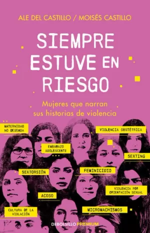 De losmicromachismos al feminicidio, del acoso laboral a la maternidad forzada, de laculturade la violación a la violenciaobstétrica,estelibro expone en voz de las víctimas el amplio espectro de la violencia contra las mujeres en nuestro país.Para las mujeres, en un país como México, la expectativa de vivir en riesgo es constante. En sus casas, en lascalles,en el transporte público o en el trabajo, en cualquier lugar y momento, siempre existe la posibilidad de ser violentadas.Sibien conocemos historias de extremaviolencia enlosmedios de comunicación y el tema ha adquirido cierta visibilidad, tambiénexisten muchas historias de violencia cotidiana que se quedan guardadas en la privacidad de los hogares. Ya sea por miedo,por vergüenza o por creer que es natural, la realidad es que muchas mujeres no saben que son víctimas y es complejo el camino para enfrentar la situación y a sus agresores.Alejandradel Castillo y Moisés Castillo han dedicadoya dos libros anteriores, Amara madrazosy Los Nadie, a narrar estaclase de historias,pero el aumento en los casos de violencia contra las mujeres y la brutalidad con que se cometen los han llevado a dedicar Siempre estuve en riesgo a estas violencias en particular. Su intención es la de presentar y visibilizarhistoriasque de otra forma no se conocerían, pero que muchos y muchas jóvenes han vivido en carne propia, y en última instancia, a poder reconocer la violencia y nombrarla, además de proporcionar herramientas para atenderla.