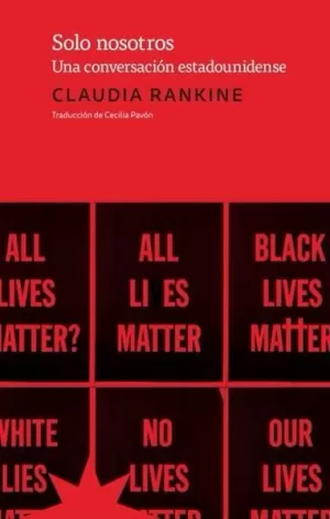 "En Solo nosotros, Claudia Rankine recorre espacios liminales como un aeropuerto, una sala de teatro, una reunión de padres en una escuela, una cena, una sala de espera en un consultorio médico, y en cada uno observa y reflexiona sobre los alcances y las consecuencias de la discriminación estructural, del privilegio masculino blanco, de los nítidos resabios de la esclavitud estadounidense. A partir de una investigación multifacética, que incluye desde poemas, fotografías y tuits hasta estadísticas, notas periodísticas y bibliografía de diversas disciplinas, Rankine compone un libro fascinante en el que su propio texto se va mezclando con estas fuentes a partir de un original sistema de verificación y, mientras tanto, se interroga a ella misma, a quienes la rodean y también a nosotros."_ Editorial