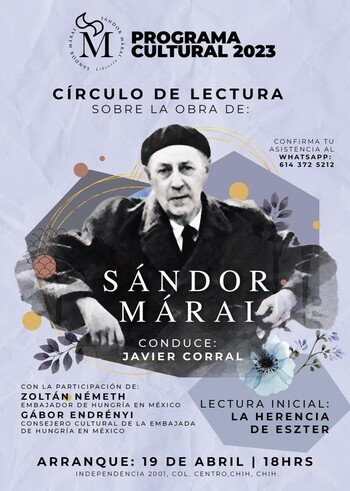 Javier Corral, ex gobernador de Chihuahua, encabezará un Círculo de Lectura de las obras más importantes traducidas al español de Sándor Márai, como parte del Programa Cultural 2023 de la librería con el mismo nombre del autor húngaro, inaugurada por el político chihuahuense hace unos meses.